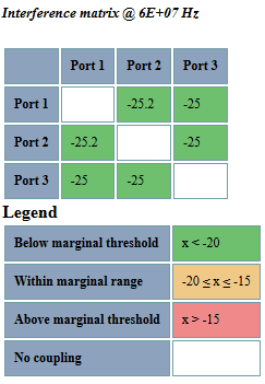 The off-diagonal components of a multiport S-parameter matrix contain all the required information to create an interference matrix. The user sets the maximum and minimum thresholds and the colours indicate if the cross-coupling between the ports are within the acceptable range. The rows represent the transmitting ports and the columns the receiving ports. Green boxes indicate that interference between the ports is below the threshold minimum. The diagonal elements contain no cross-coupling information since it is the power measured at the port from exciting the port itself.