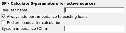 The S-parameter load impedance for each of the port sources can be specified at the source itself. If no such impedance was specified, the system impedance ( ) value specified with the SP card will be used (if this value is not specified it defaults to 50 ). This S-parameter load impedance will be added automatically to each port. The only exception is the waveguide port (AW card) and the modal port (AB card) where S-parameters are related directly to the corresponding waveguide impedance.