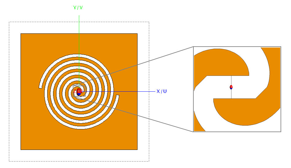 Figure 7. Top view of the complementary two-arm slot antenna showing the wire port at the feed line.