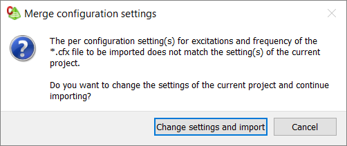 Note: If a .cfx file is imported and it contains an empty configuration (for example, it contains no entities, only frequency), the configuration is removed during the import process. - To continue with the model import and merge the configuration settings,