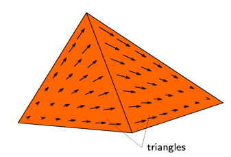 In Figure 1, only two triangles are shown sharing a common edge. Each triangle also has two other edges. If these edges are connected to triangles, then additional basis functions would be required. Therefore for a triangle connected on all three sides, a total of three basis functions would be defined. Within the triangle element the total current would then be the sum of these three basis functions.