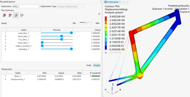 - DOE fit-based optimizations, as well as trade-off and field predictions, can now be verified by performing verification runs. A single solver job is run, with design variable values set to their fit-based optimal values or trade-off slider selections. Results are viewable in the Results Explorer, allowing you to verify the optimal or predicted values.