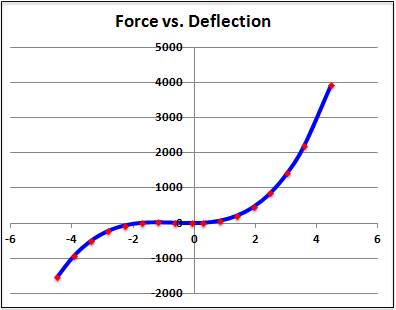 Spline stiffness blocks store the static stiffness properties of a bushing. The data is stored in a table of monotonically increasing deflections versus forces. If the direction block selects the spline stiffness formulation for a given direction, for example FZ, then the property file should contain a corresponding spline stiffness block for that direction, such as [SPLINE_STIFFNESS_FZ].