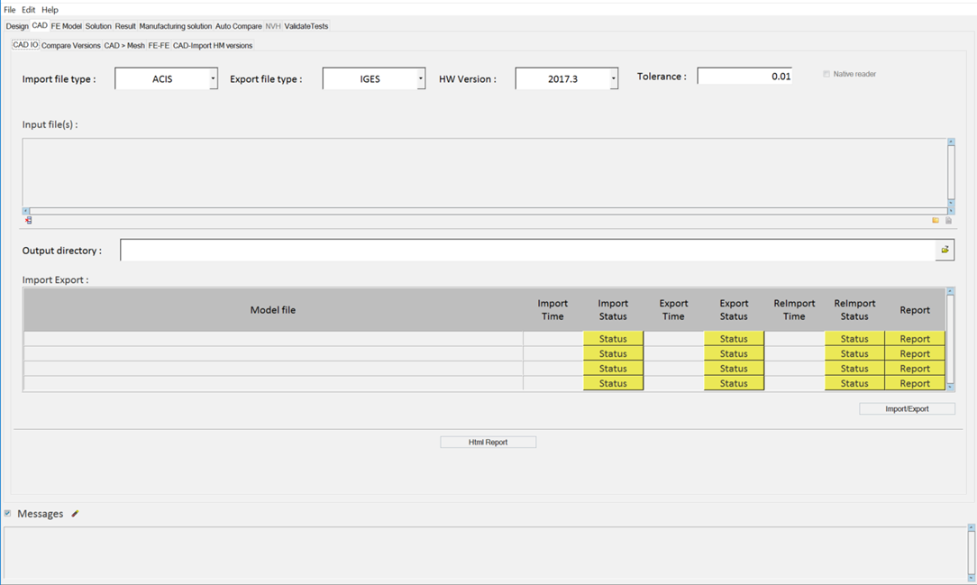 The native CAD model is imported into HyperMesh and exported using CAD readers in HyperMesh that are run in the background. The exported model is re-imported and overlaid. With superposed models using advanced CAD-CAD comparison, any loss of geometric data is identified, along with any entity changes. A reference report is also created.