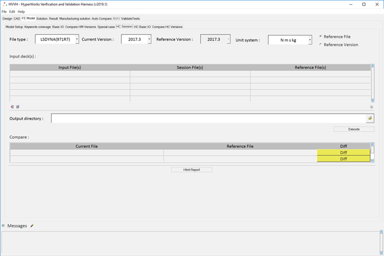 If you select Reference Version instead of Reference File, the GUI changes slightly. All fields are the same except under the Input Deck section, where the Reference File column is omitted. Select the Current and Reference versions. The HyperCrash session file is executed on the Current and Reference versions and the export decks. Exported decks in the Current and Reference versions are compared.