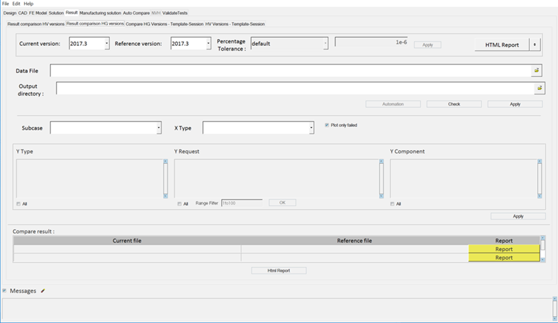 The Result comparison HG versions tab performs time history comparison. From this tab, you can perform the curve's super positioning of the current and reference version result files and plot the differences in curves.