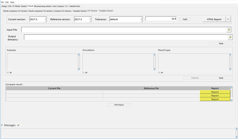 From the HV Versions - Template-Session tab, HyperView template or session files are used as the input files. You can select some or all of the displayed subcase, simulation, and result types and compare them across any versions of HyperView.