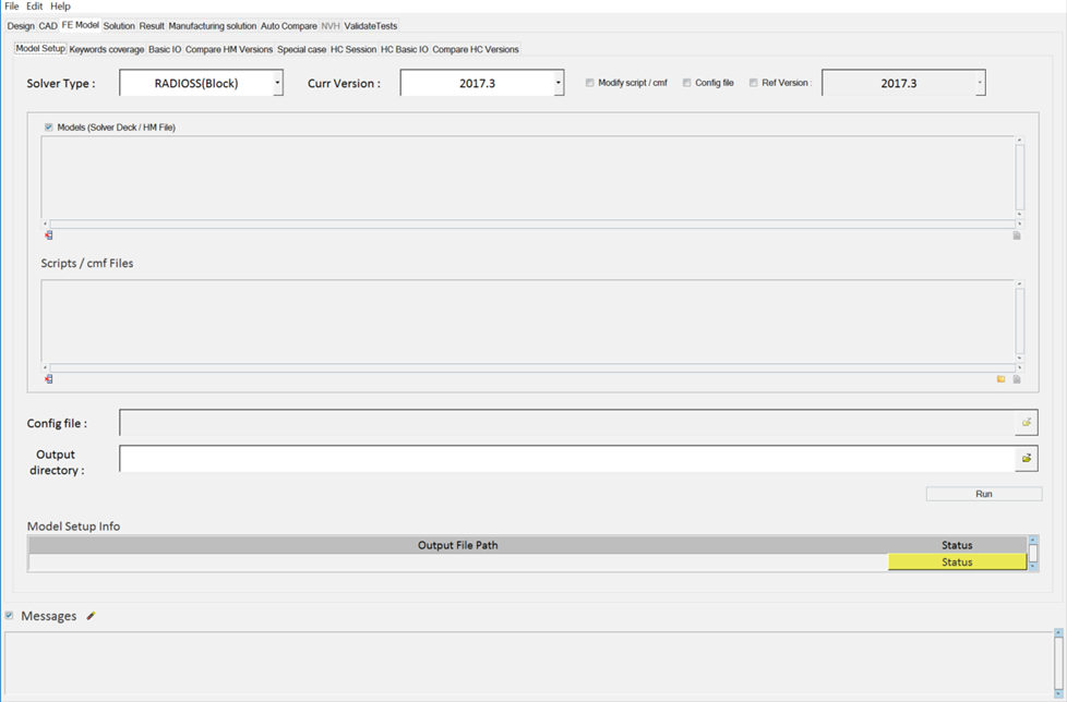The Compare HM Versions tab allows you to compare input/output solver files between any two HyperMesh versions. You can also compare with a reference file or previously certified file. This is most useful for non-HyperMesh generated solver decks.