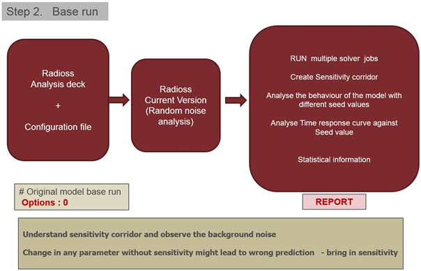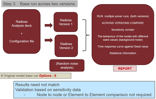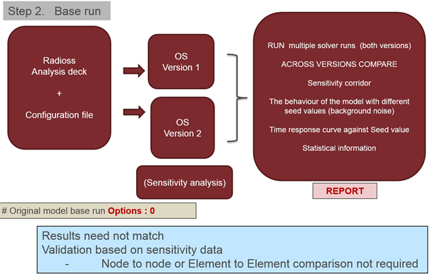 Check if the model can be considered a reference model for further study. Random noise/sensitivity analysis can be a base run with different seed values. Compare across Radioss versions using the sensitivity corridor.