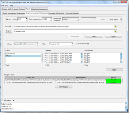 Across two HyperView versions, the solver results are compared. Comparison of different data types are available. For example, for a vector (displacement), all components (magnitude, x-displacement, y-displacement, and z-displacement) are compared for the entire model and the results are shown.