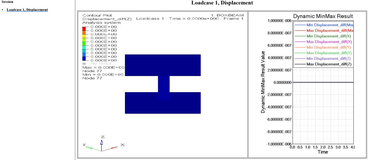 Across two HyperView versions, the solver results are compared. Comparisons of different data types are available. For example, for a vector (displacement) all components (magnitude, X-displacement, Y-displacement, and Z-displacement) are compared for the entire model and the results are shown.