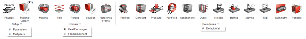Flow Set up the simulation model, materials, domains, and boundaries. Attention: The icons shown on the ribbon below are used to complete this workflow. Click an icon to learn more about the tool.