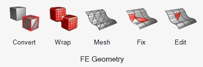 The Geometry ribbon consists of tools for converting, repairing, creating, editing, and validating the geometry. The tools available under the FE Geometry sub-section can be used to convert a geometry model to an FE model, cap the openings automatically, define local or proximity-based wrap controls, wrap the model, remesh the wrapped results, and fix the mesh quality.