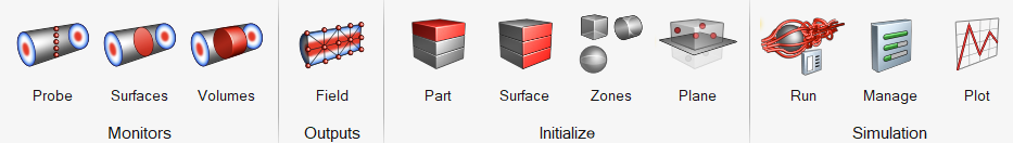 The Solution ribbon is used to set up monitors for any individual point, surface, or volume set output. The Field tool is used to set the nodal output frequency for the entire model. The Initialize tools are used to set the nodal initial conditions for variables like pressure, velocity, and variables specific to each turbulence model.