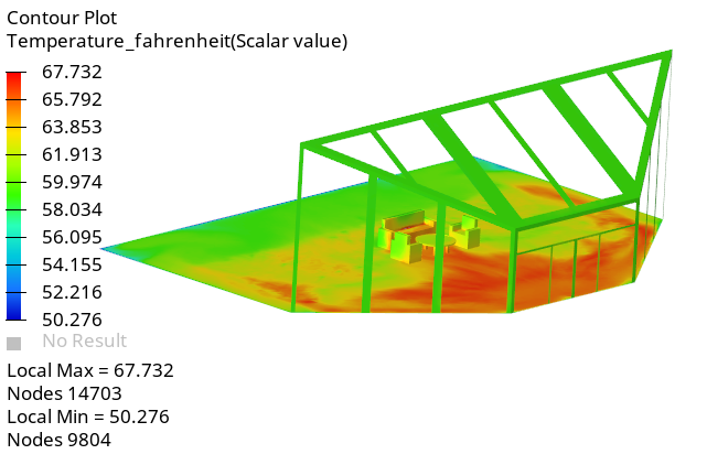 In this step, you will start by creating an expression for plotting the temperature values in Fahrenheit units. Then, you will create an animation of the magnitude of temperature on the floor and the thin solid wall surfaces.