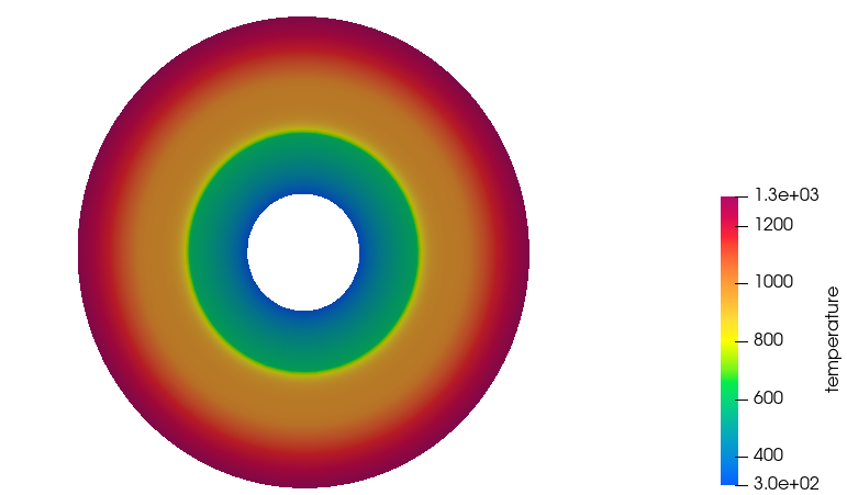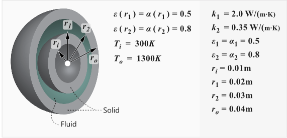 The problem consists of a fluid region with arbitrary material properties between two concentric spheres with surfaces held at fixed temperature, as shown in the following figure, which is not drawn to scale. The radius of the outer sphere is 0.04 m and the radius of the inner sphere is 0.01 m. The inner surface of the inner sphere is defined to have a constant wall temperature at 300.0 K (26.85 ºC). The outer surface of the outer sphere is defined to have a constant wall temperature at 1300.0 K (1026.85 ºC). The fluid within the spheres is defined as a non-conducting material, allowing heat to transfer via radiation only.