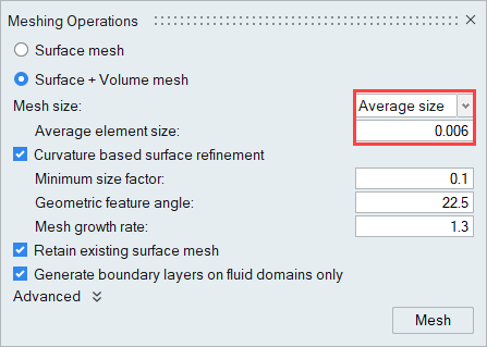 In this step, first you will create a surface mesh using the Interactive meshing tool; then, you will specify a global mesh size and growth rate for the model and generate the volume mesh using the Batch tool in the Mesh ribbon.