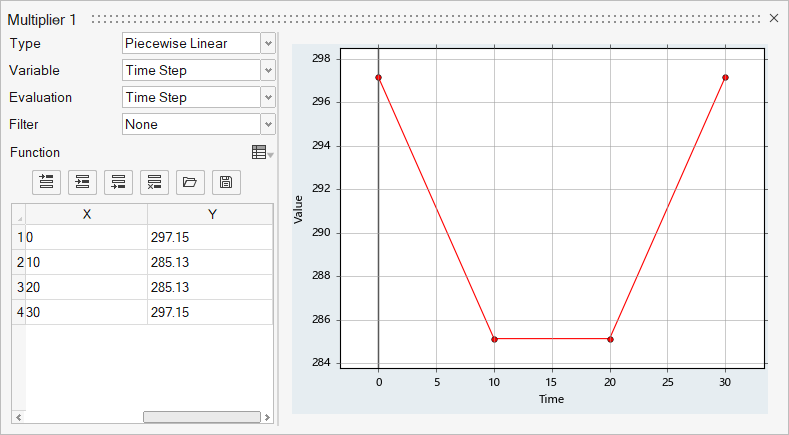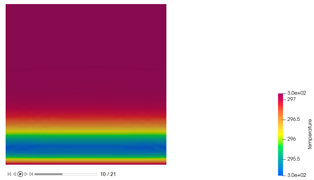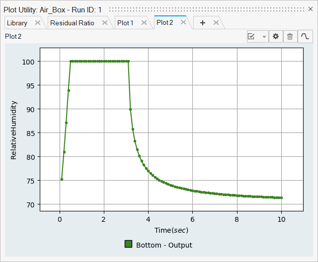 From the above plot, we can see that the Air volume initial temperature is set to 297.15 K. The Bottom Wall temperature drops to 285.13 K over 1 sec, maintains 285.13 K for 1 sec, and then rises back to 297.15 K over 1 sec. The dew point temperature of the air at 70% RH is 291.14 K and is reached at 0.5 and 2.5 sec. On the whole we can see that both condensation and evaporation occurs when the dew point temperature is reached, as explained above.
