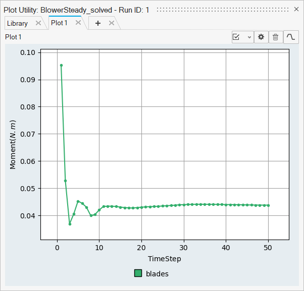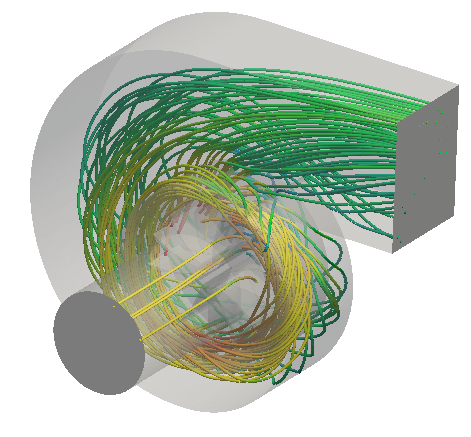 In this tutorial, you successfully learned how to set up a steady state simulation involving a rotating reference frame in a centrifugal blower. You started by importing the mesh and then once the case was set up, you generated a solution using AcuSolve. Then, you computed the blower momentum using the Plot Utility and created a contour plot for pressure and velocity streamlines using HW-CFD post.