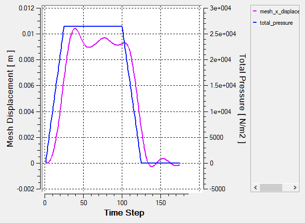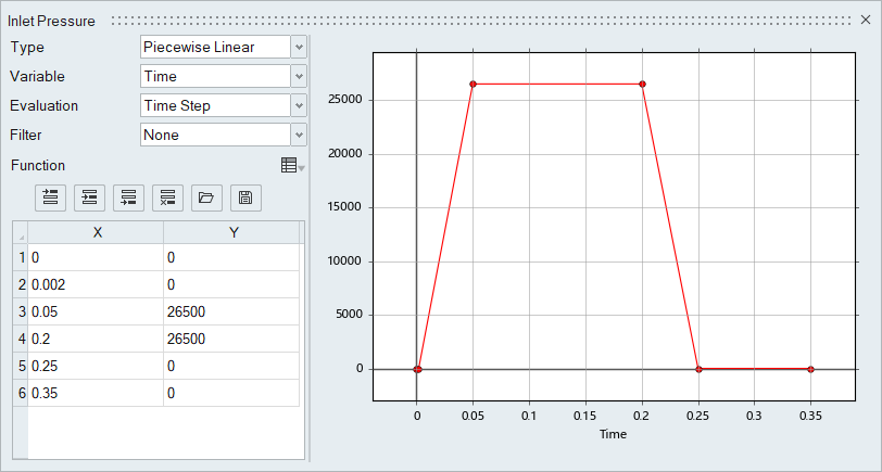 For this case, the transient behavior of interest occurs in the time it takes for the pressure to ramp up and ramp back down, which is given by the transient pressure profile. To allow time for the spring to recover, additional time will be simulated. For this tutorial, 0.1 s is added after the pressure drops back to initial conditions, for a total duration of 0.35 s.