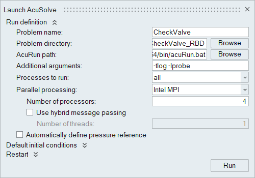 This tutorial provides the instructions for setting up, solving, and viewing results for a simulation of the opening of a pressure check valve. In this simulation, AcuSolve is used to compute the forces on the valve due to the time-varying inlet flow field and to compute the motion of the valve that results from these flow forces. This tutorial is designed to introduce you to a number of modeling concepts necessary to perform simulations of rigid-body dynamics.