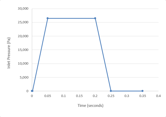 At the start of the simulation the flow field is stationary. Flow is driven by the pressure at the inlet, which varies over time as a piecewise linear function shown in Figure 2. As the pressure at the inlet rises, the flow will accelerate as the valve opens. The turbulence viscosity ratio is assumed to be 10.