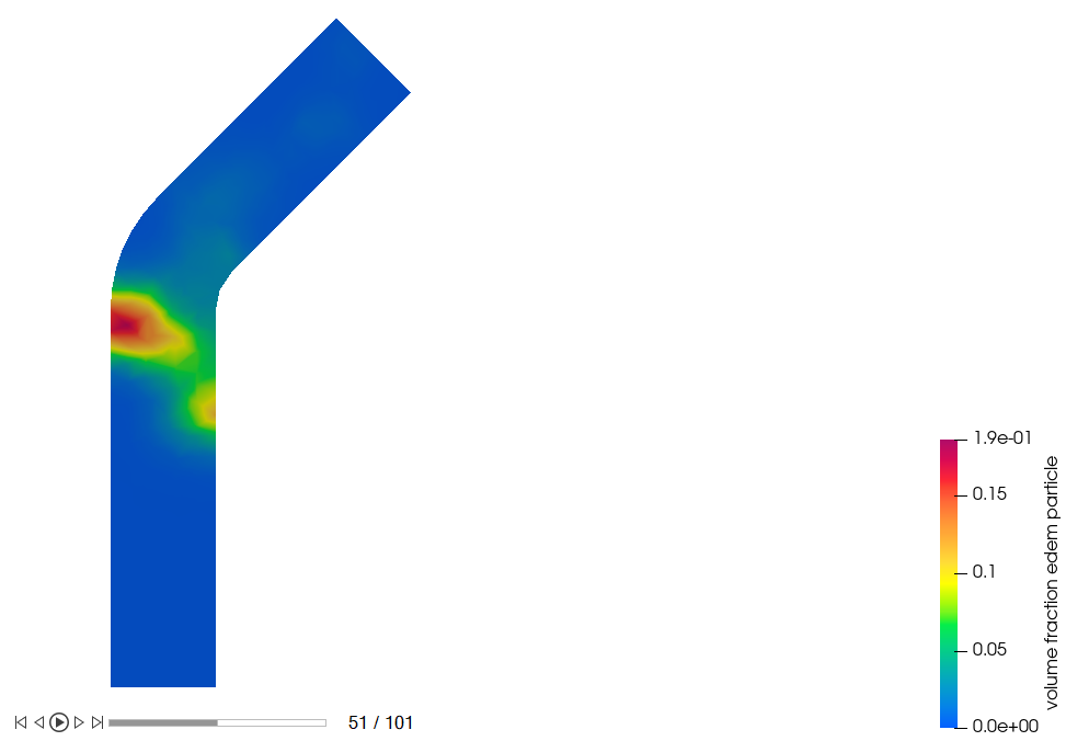 The model consists of a cylindrical pipe with a 45-degree bend. The radius of the pipe is 0.25 m and the particle inlet is located midway through the length of the pipe.