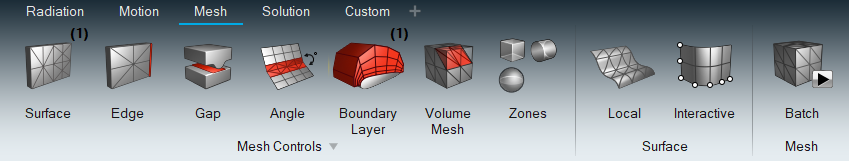 The ribbon allows you to quickly access tools and standard functions, and is located along the top of HyperWorks CFD. Click on an icon to open the related tool. Hovering over a group of icons may reveal additional tools.