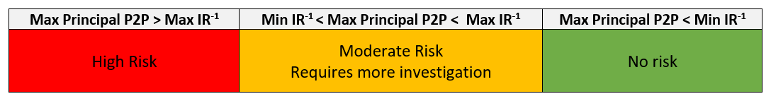 The squeak evaluation is based on the contact plane relative displacement. As per the E-Line method definition, in X and Y local Direction. The Max Relative Peak to Peak amplitudes, also called MAX Principal Peak to Peak (MAX Principal P2P), are compared to the inverse of Impulse Rate [mm] (IR-1) values from the specific pair of materials along each E-Line.