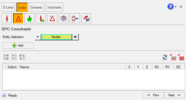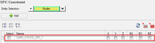 In this step, you can define boundary conditions or constraints on nodes and associate them to subcases. The panel SPC Constraints as shown below.