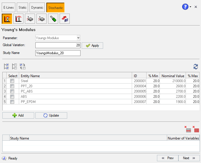 - Select Parameter - a default selection list that shows the selected parameter. In this case, Youngs Modulus is the value.