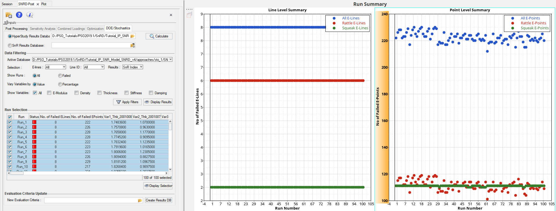 SnRD Post Stochastics and DoE module allows the analyst to investigate hundreds of simulation results in a powerful way. When multiple variational studies have been setup, and results imported, will automatically post process all the Rattle and Squeak results for high level and deep dive investigation. The analyst can have multiple goals out of this analysis. Some of them are detailed below: