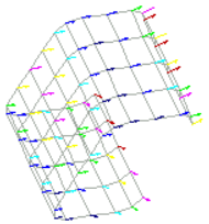 The vector plot shows the original position of the model and displays vectors at each node indicating the results of the analysis. The color of the vectors corresponds to colors in the legend of the vector plot, and indicates the magnitude of the vectors plotted.