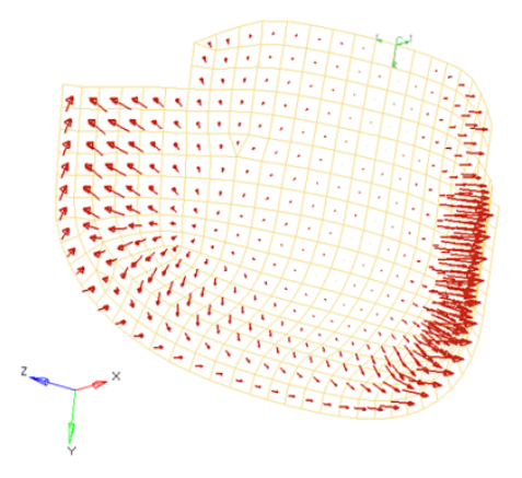 Figure 16. Curved Surface with a Polynomial Function for an Applied Pressure Magnitude = -((x^2+2*y^2+z)/1000). The pressure function is defined in terms of the cylindrical coordinate system displayed at the top edge of the elements.
