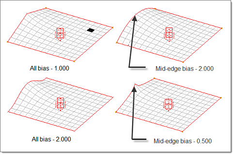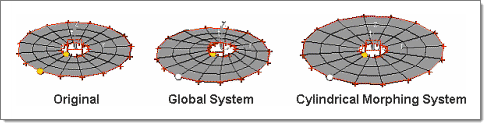 system. This option transforms the perturbations passed from handles to nodes using the selected morphing system. For rectangular systems this has no effect, but for cylindrical and spherical systems handle movements in the radial, theta, and so on, directions will be applied to influenced nodes in the radial, theta, and so on, direction. Thus, when you move a handle radially, the nodes which it influences will move radially as well instead of simply following the handle. This option is similar to the use system for nodes option for along xyz in the Morph panel, but it applies to all morphing operations. In Figure 1, notice how the morphing differs after