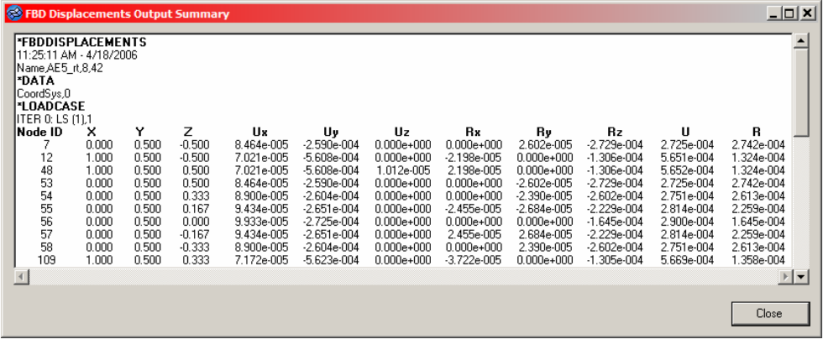 After you define an element set with an associated node set, all appropriate displacements and rotations are extracted. Results can be output to load collectors for graphical review, a text summary table, and a formatted .csv file which can be loaded into traditional spreadsheet software packages.