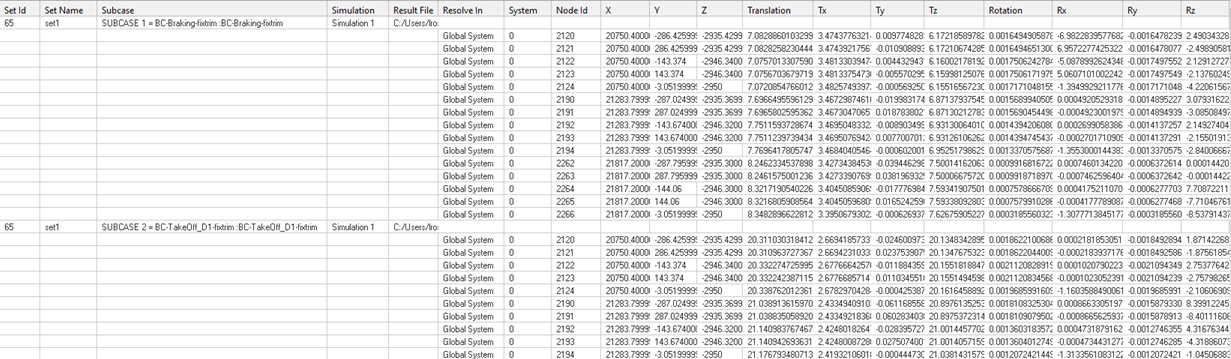 Creates tables with free-body displacements and rotations for the selected sets and loadcases.