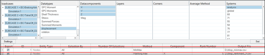 The first column shows the source files, selected load cases, the data type, and all other relevant information, if any.