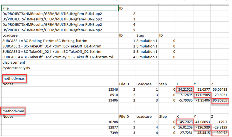 The column corresponding to the method=max shows what the entity expects for the maximum X, Y and Z components, for displacement in this example, as well as for the same entity the relevant values for the other components. The same is true for method=min.