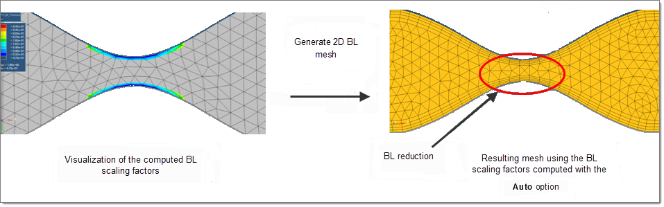 - If the region to be meshed is specified by Elements Engineering Solutions will perform a proximity check based on the boundary nodes of the With BL boundaries and compute BL thickness scaling factors to avoid BL intersections.