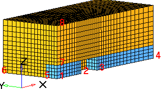 Pyramids are created on all the quad faces defining the empty pocket shown (2-3). Pyramids are included in component fluid_hex. Component edges_xy and edges_xz are created to generate the 2D meshes that are later used to define the bounding box in the CFD Tetramesh panel.