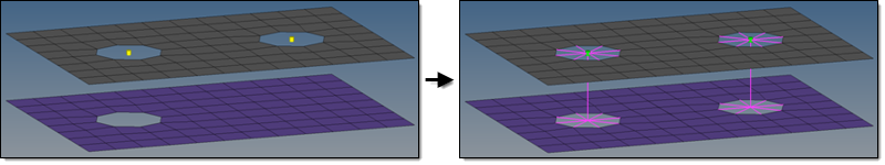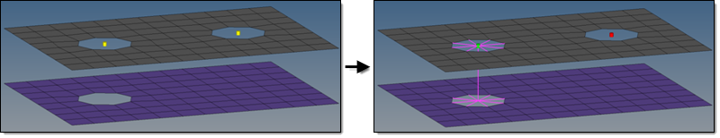 - Connect a link without an available hole by joining the nodes found inside the circle with the specified diameter around the projection point via head elements. Used if holes are not required when using the use hole, if available option or fill and remesh hole, if available option.