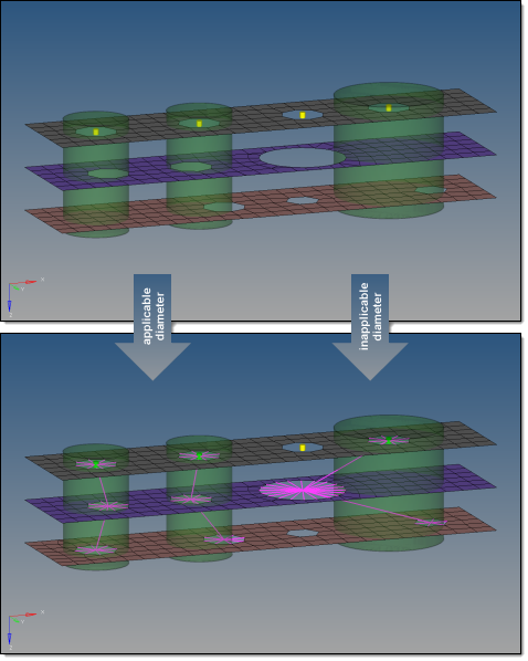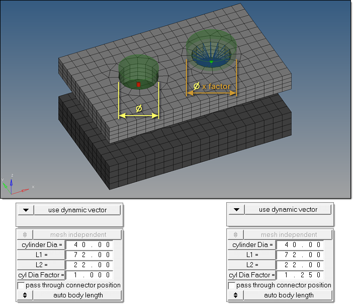 Note: The hole detection mechanism for the last three options takes into account a cylinder which is defined in the Hole Detection Details subpanel. The hole consideration cylinder option can be defined as a factor of the no hole connection dia option or as an exact diameter. Principally holes which are inside or touching the cylinder can be detected, but the hole consideration is reduced to one hole per link per connector. Additionally holes need to fit to the requested dimensions, which are also defined in the Hole Detection Details subpanel. - For the create hole, if none, and use hole options, a mesh modification