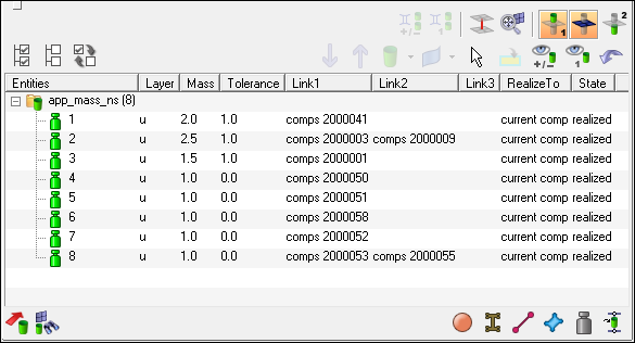 HyperMesh handles non-structural masses for Nastran as group entities with a card image NSM1 or NSML1 assigned to them. Whereas normally a connector creates a specific element construct during realization, the NSM connector does not create any element. Instead, each NSM connector receives one group with the appropriate NSM1 or NSML1 card assigned.