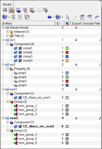 The groups created along the NSM connector realization are named as nsm_group_<CE_ID>.nsm_group_<CE_ID>, and placed in the current include. A new component named CE_Mass_inc_<include name> is created which contains all the connector information for that include. Each include is meant to host its own CE_Mass_inc_<include name> component, and HM will produce a warning if the component name already exists in a different include. This helps ensure that unrealizing and rerealizing nsm connectors will keep the FE data in its original include.