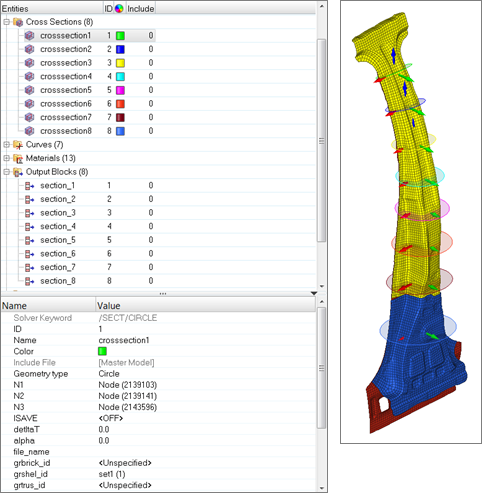 A cross section is defined by a set of nodes and elements. These sets can be explicitly defined in the entity or computed by intersecting a given geometry (plane, circle) with a set of elements or components.