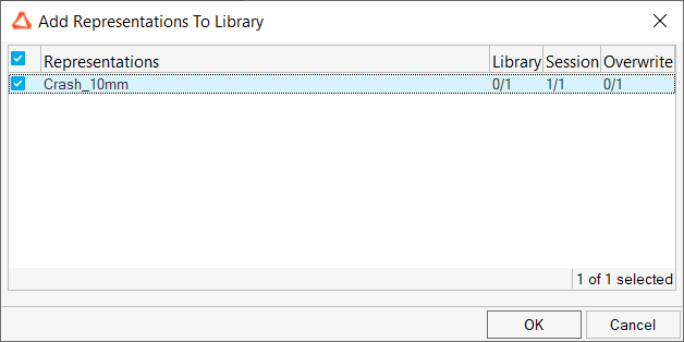 The Add Representation to Library dialog displays information regarding the availability of representations in library, session, and overwrite details.