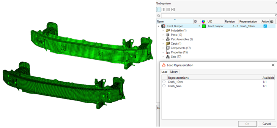 For example, for front crash analysis you will want greater model fidelity in the front bumper, so you can load ‘Crash_5mm’ representation versus loading in ‘Crash_10mm’ representation when assembling a rear crash model where the increased level of detail is not required.