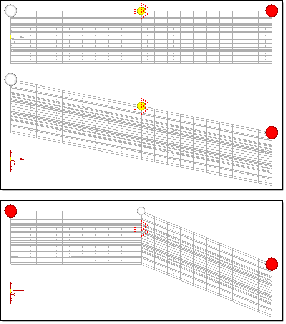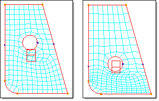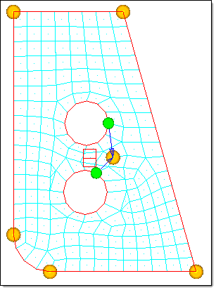 Figure 6. Dependencies used to Reduce Mesh Distortion. Two dependent handles were created on the edges of the part near the center hole. The dependent handles were constrained along vectors parallel to the sides of the part. When the handle at the hole is moved downward, the dependent handles follow and reduce mesh distortion by spreading the morph across the entire part instead of only around the hole.