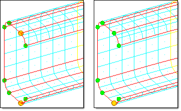 Figure 4. Dependencies. In the model on the left, the three green handles on the top are dependent on the orange handle on the top. The bottom has similar dependencies. The top and bottom halves of the cross sections are controlled by just two handles. In the model on the right, all of the green handles are dependent on the orange handle. The entire cross section is controlled by one handle. Note that the dependencies can extend beyond the 2D domain boundaries.